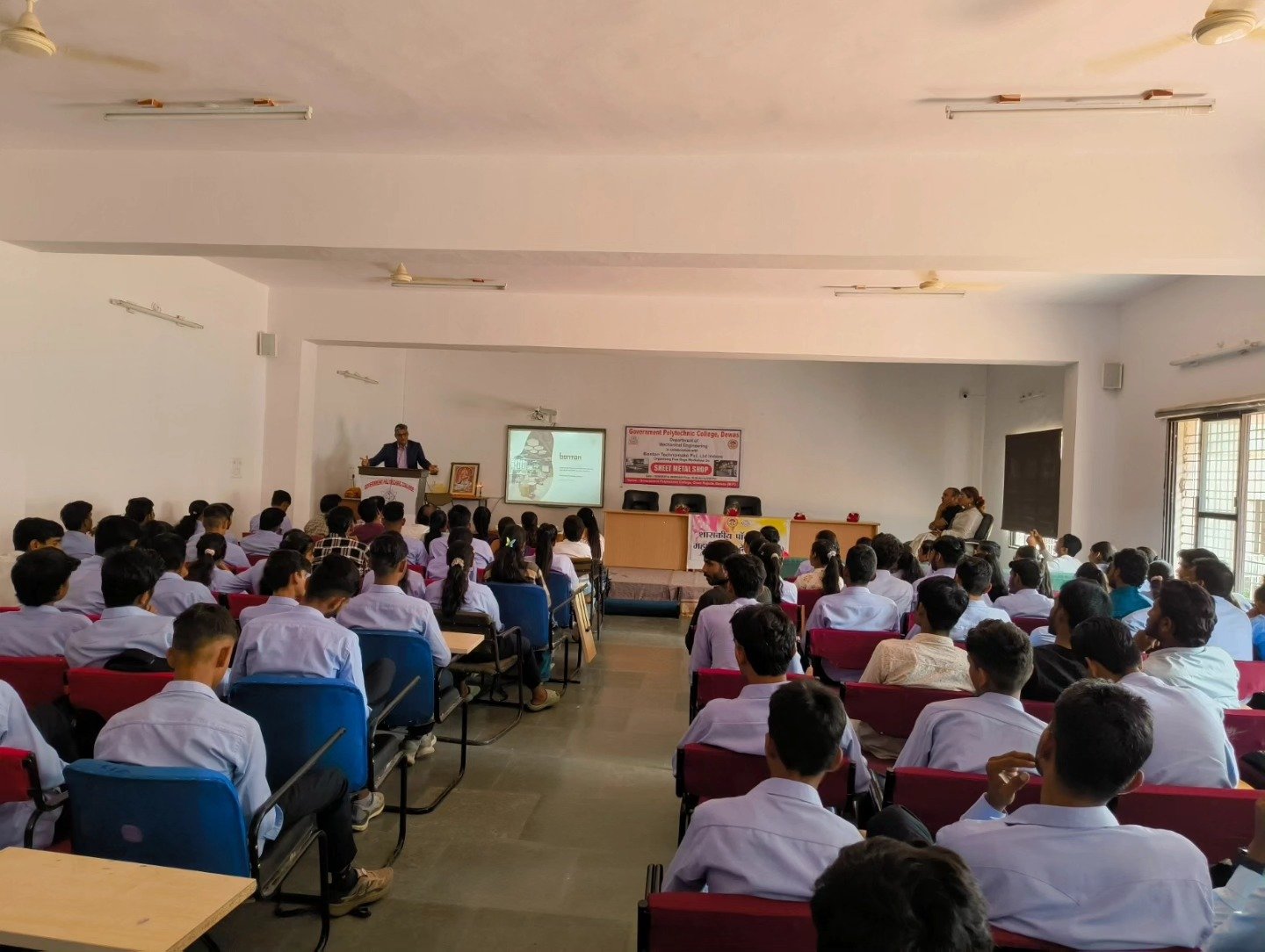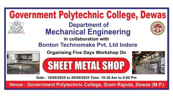 शासकीय पोलीटेक्निक महाविद्यालय देवास द्वारा बोनटोन टेक्नोमेक प्रायवेट लिमिटेड इंदौर के समन्वय से दिनांक 16.09.2025 से दिनांक 20.09.2025 (पाॅच दिवसीय) तक शीट मेटल शाॅप विषय पर कार्यशाल का आयोजन किया जा रहा है।उक्त कार्यशाला का उद्घाटन मुख्य अतिथि श्री अंजन शाह, सचिव, एसोसिऐशन इंण्डस्ट्रीज देवास, विशेष अतिथि श्री गिरीश चैबे, सेल्स हेड बोनटोन टेक्नोमेक प्रायवेट लिमिटेड इंदौर तथा डाॅ. सोनल भाटी, प्राचार्य द्वारा माॅ सरस्वती के चित्र पर माल्यार्पण एवं दीप प्रज्ज्वल के साथ किया गया ।